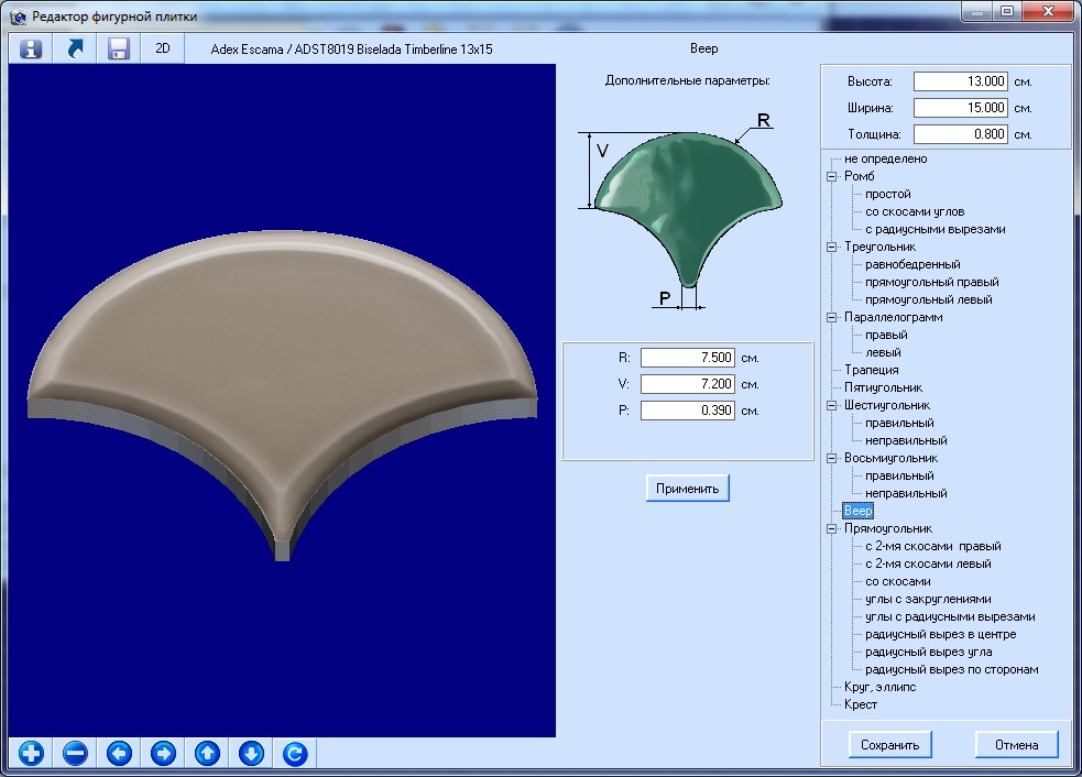 Дополнительные значения по умолчанию. 1. Ромб со скосами углов. Размер скоса R = 2 см. 2. Ромб с радиусными вырезами. Радиус выреза R = 0.75 см. 3. Треугольник равнобедренный. Радиус закруглений углов R = 0 см. 4. Параллелограмм (шеврон) левый и правый. Размер скоса R определяется углом наклона 60 градусов. 5. Трапеция. Размер скоса R определяется углом наклона 60 градусов. 6. Пятиугольник. Высота скоса R равна половине высоты плитки. 7. Шестиугольник неправильный. Высота вертикальной стороны R равна половине высоты плитки. 8. Восьмиугольник неправильный. Размер скосов R = 2 см. 9. Веер. Радиус закругления R равен половине ширины плитки. Высота верхней части V равна радиусу закругления R. Ширина хвоста P вычисляется автоматически, но является редактируемым параметром. 10. Прямуогольник с двумя скосами правый и левый. Размеры скосов R = 2 см. и V = 2 см. 11. Прямуогольник со скосами. Размеры скосов R = 2 см. и V = 2 см. 12. Прямуогольник углы с закрулениями. Радиус закруглений R = 1/6 ширины плитки. Высота и ширина выемки V = 1/6 ширины плитки. Глубина выемки P=0.4 см. 13. Прямуогольник углы с радиусными вырезами. Радиус вырезов R = 2 см. 14. Прямоугольник радиусный вырез в центре. Радиус выреза R равен 1/4 меньшей стороны. 15. Прямоугольник радиусный вырез угла. Радиус выреза R = 2 см. 16. Прямоугольник радиусный вырез по сторонам. Радиус выреза R равен более длинной стороне. Размер полки V=0.1 см. 17. Крест. Ширина лопасти креста R равна половине меньшей стороны. Если дополнительный параметр по умолчанию невозможно установить в силу габаритных размеров, то будет выставлено минимально возможное значение. 18. Фонарик. Радиус R закруглений равен 1/4 меньшей стороны габаритных размеров.