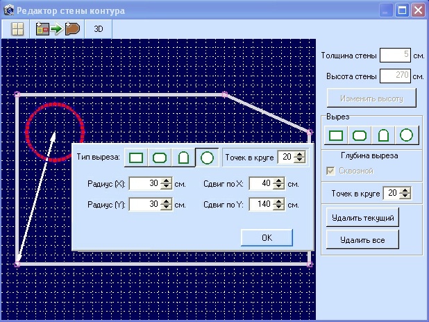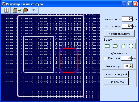 Но в окне редактирования стены основного контура отображается полная поверхность стены (вид изнутри). Кроме указанных изменений данный режим позволяет сделать в стене сквозные или несквозные вырезы разной формы: прямоугольной, прямоугольной со скругленными краями, арочной и круглой (эллипсной). Создание вырезов аналогично созданию вырезов в плите. Выберите тип выреза соответствующей кнопкой. Не допускается пересечения одного выреза с другими и с контурами стены, окон и дверей - при такой ситуации текущий вырез будет удален. Вырез рисуется одним нажатием мыши - щелкните в нужную точку сетки левой клавишей мыши и удерживая её сформируйте необходимый вырез. Корректность выреза проверяется при отпускании клавиши мыши. До отрисовки выреза вы можете задать характер выреза - сквозной или нет и если нет, то значение глубины выреза, а также количество точек в круге (если вырез круглый). Красный цвет выреза означает что он являются текущим. Удалить текущий вырез можно кнопкой 'Удалить текущий'. Удалить все нарисованные вырезы можно кнопкой 'Удалить все'.