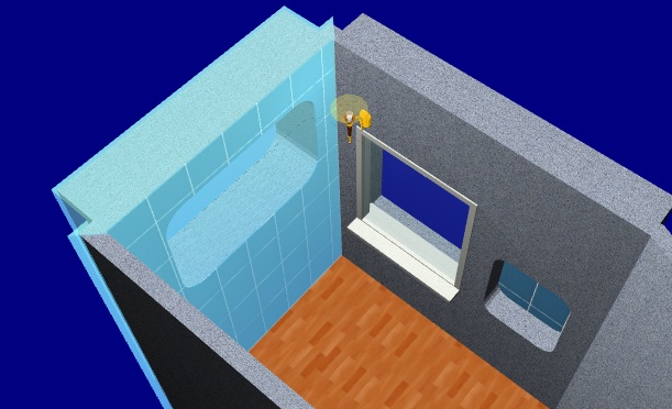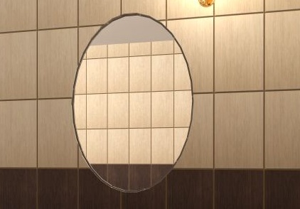 Еще одна возможность использовать вырезы в стене - встроенные зеркала, которые хорошо выглядят в рендере. Создайте вырез с нулевой глубиной (или глубже - если зеркало в нише), покройте его светлым рулонным материалом - можно специально ввести такой в справочник. Затем, в настройках рендера, поставьте этому материалу зеркальность=1, убрав все остальные параметры в 0 (для версии 7.XX+Render).