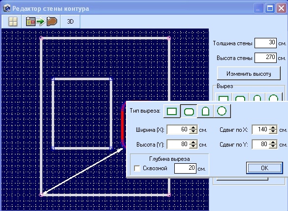 Изменить уже нарисованный вырез можно выбрав его левой кнопкой (при этом он становится красным). Невыбранные вырезы имеют желтый цвет. Далее вызвовите меню правой кнопкой мыши. Выберите 'Редактировать'. В появившемся окне можно изменить размеры выреза и сдвинуть его по осям координат относительно левого нижнего угла контура стены, а также откорректировать глубину выреза или сделать его сквозным.