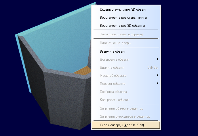 3.3. Добавление скоса (наклонной плиты) к стене основного контура доступно после создание помещения до её покрытия материалами. Выберите непокрытую стену двойным кликом мышки (точно так же, как и для покрытия). После этого вызовите меню правой клавишей мыши. Есть ограничения по доступности опции меню 'Скос мансарды' - смежные (боковые) стены должны иметь угол поворота 90 град (внутренний) и при этом на боковых стенах не должно быть скосов.