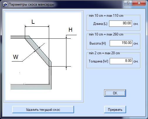 Максимальные параметры скоса вычисляются на основе размеров помещения и расположения других скосов. Вы можете вызывать таким образом форму характеристик скоса и изменять его размеры. Кнопка 'Удалить текущий скос' удаляет скос из помещения. При формировании скоса все покрытия самого скоса и связанных поверхностей (текущая стена, боковые стены, потолок) удаляются.