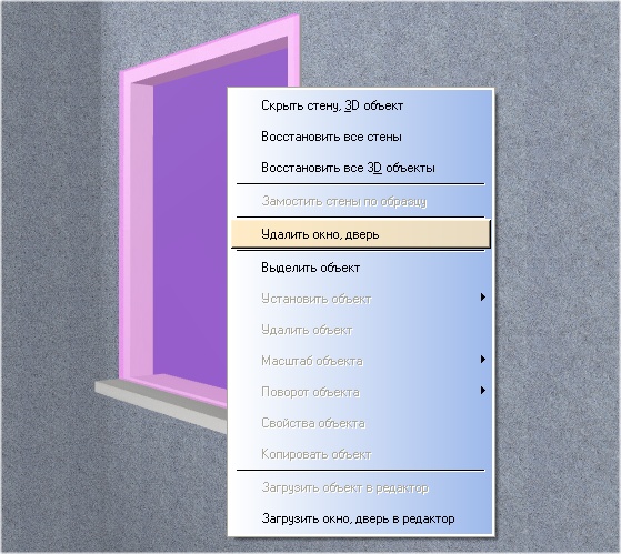Для редактирования окна выделите его двойным щелчком левой клавиши мыши и вызовите меню нажатием правой клавишей мыши. Выберите пункт "Загрузить окно, дверь в редактор". При этом текущее окно будет загружено в редактор и доступно для редактирования (для проектов, созданных в версии 7.0 и выше). Если вы изменили расположение или внешний контур окна и при этом на стене присутствует покрытие, то система предложит вам очистить покрытие, поскольку вырез для окна в стене перестал соответствовать текущему. При изменении ширины откосов они также будут очищены от покрытия.